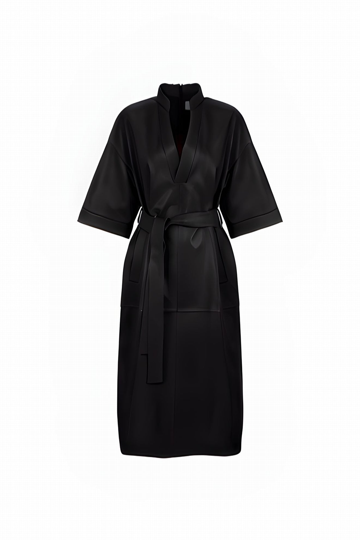 The small mandarin collar and V-neckline add a touch of finesse and charm to this leather dress, while the side slits allow for elegant freedom of movement. The belt at the waist accentuates the silhouette and completes the design with a touch of modernity.