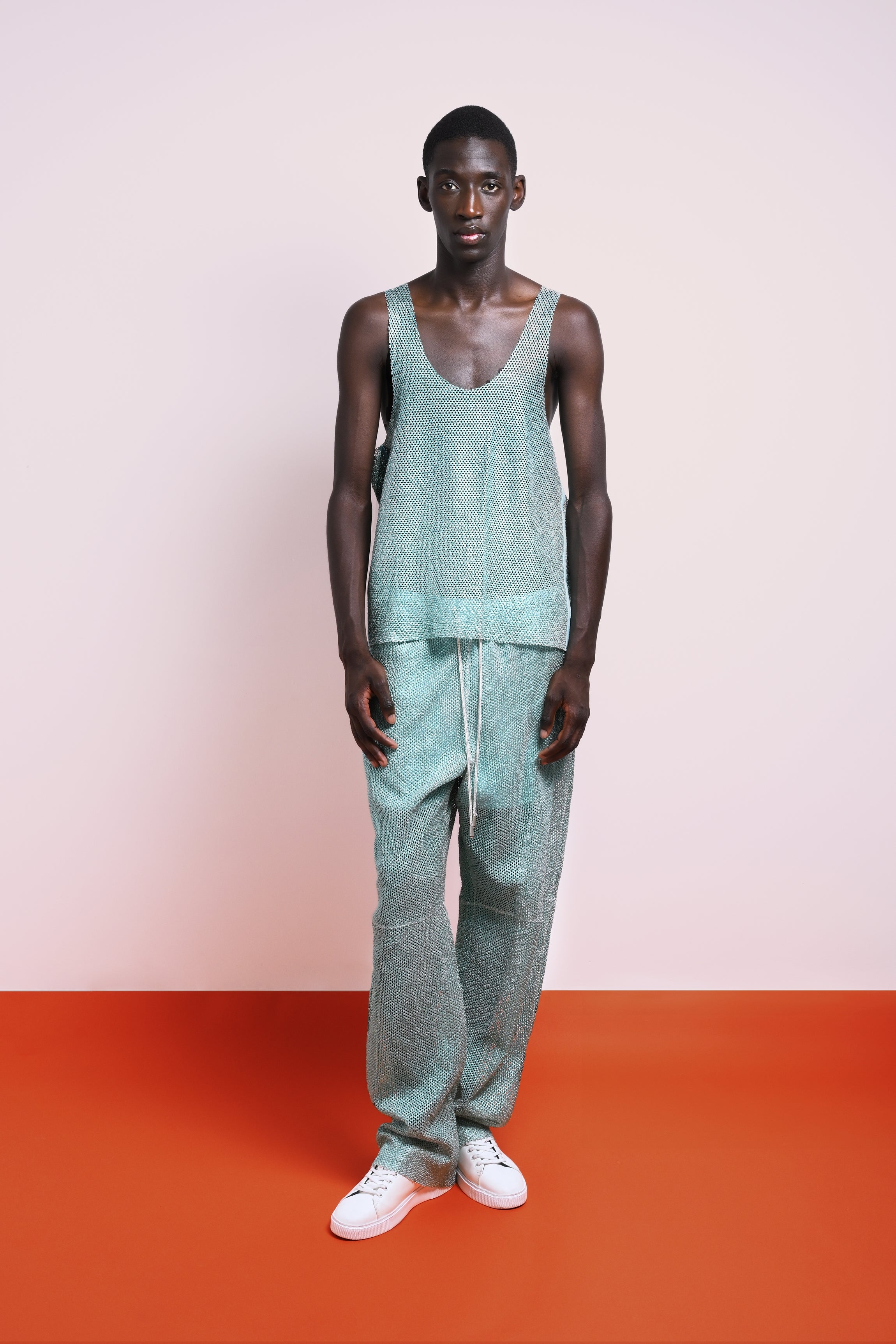 Confectionné en cuir d'agneau irisé de qualité, ce débardeur au col bateau pour homme ou pour femme présente un design unique avec une transparence subtile et des perforations délicates, créant un effet visuel élégant et moderne.