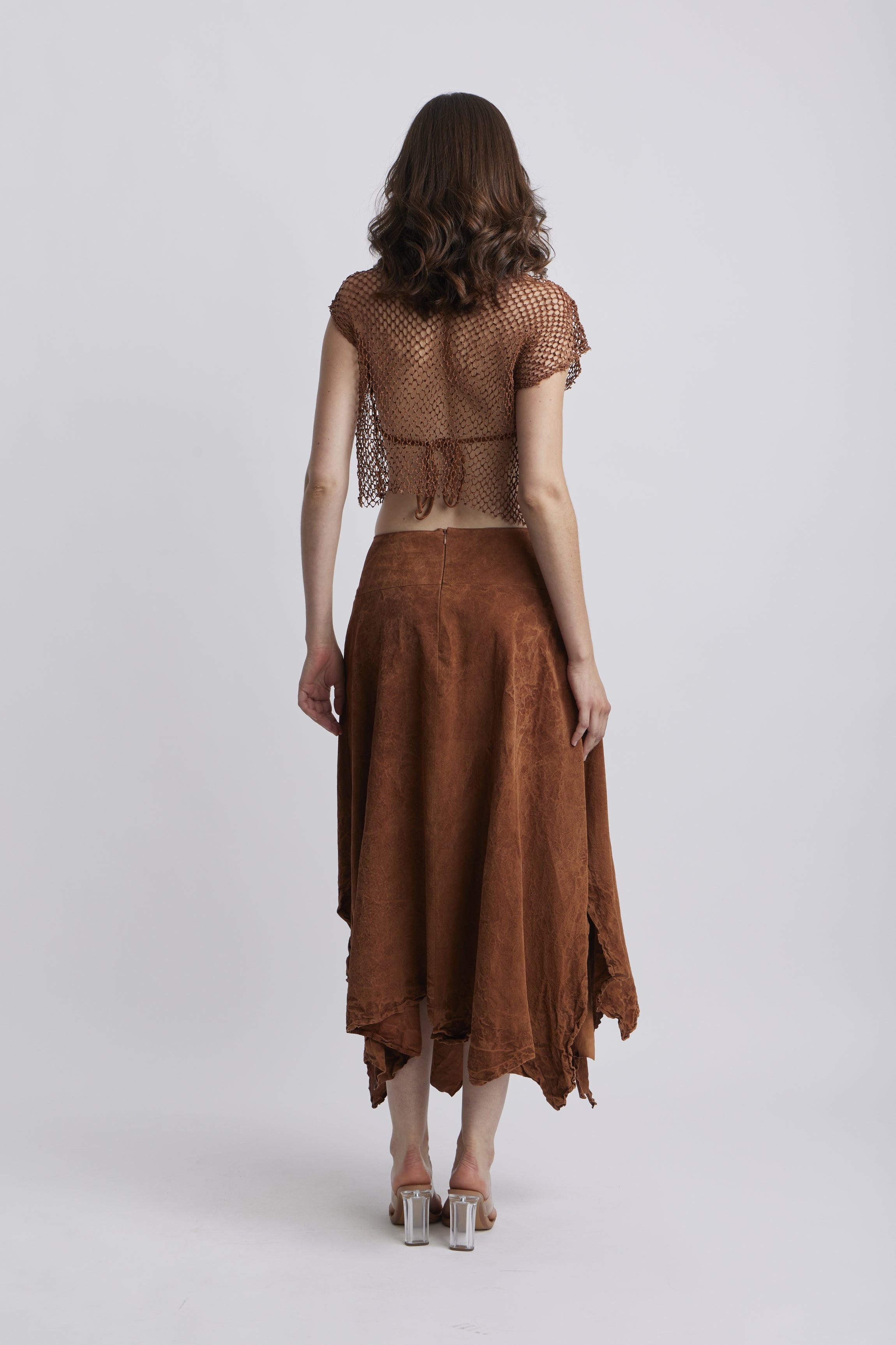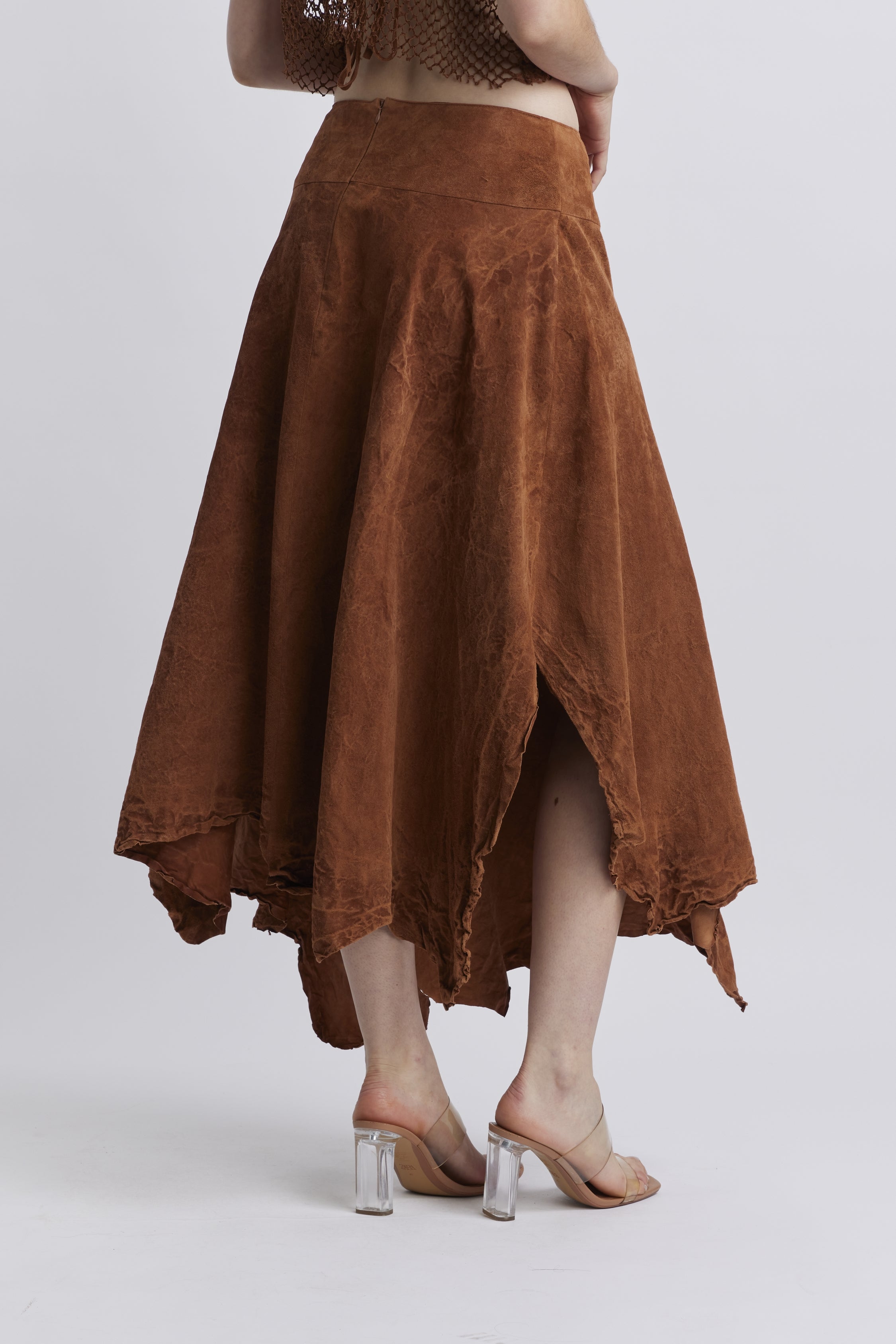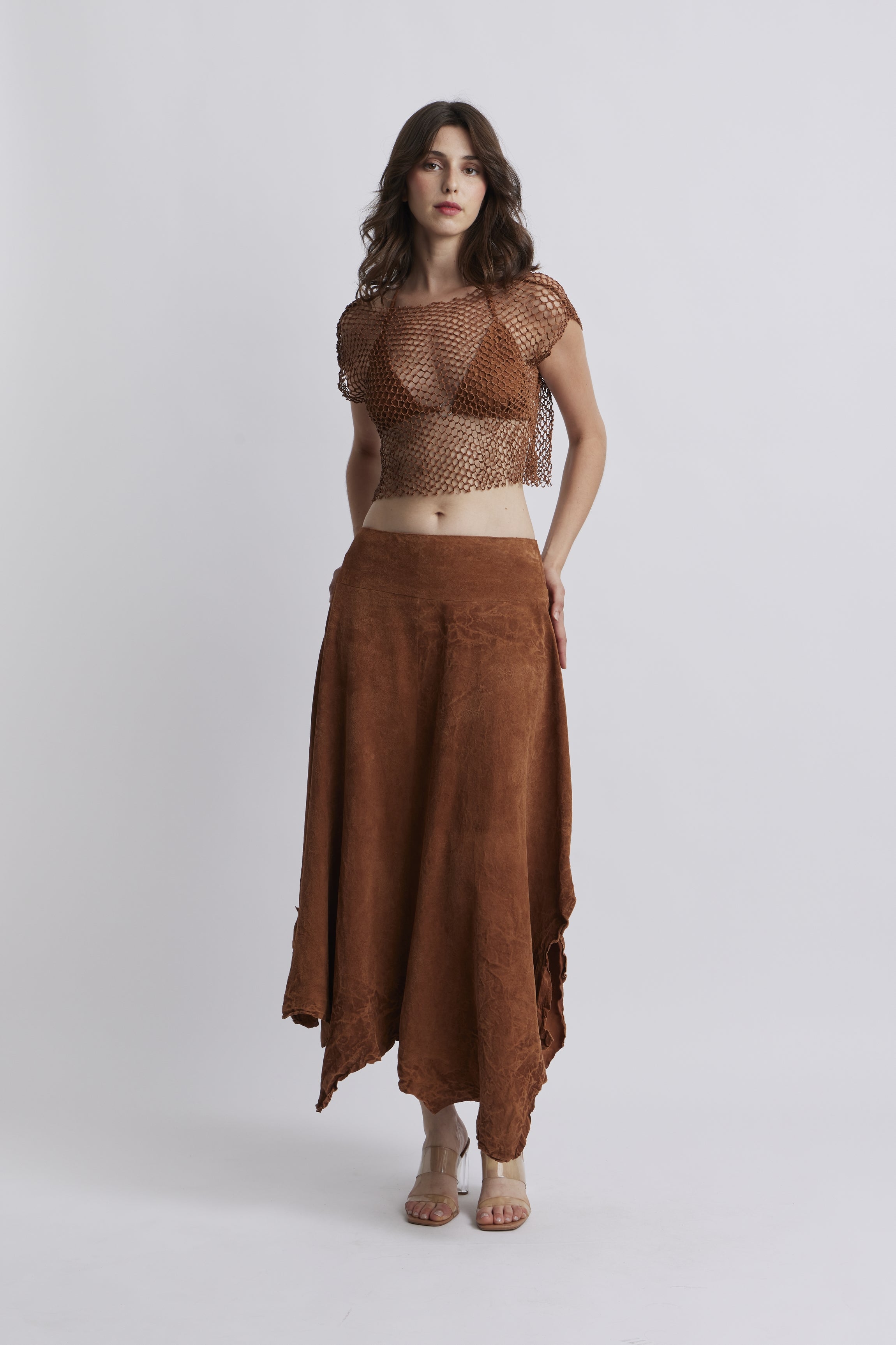Le modèle ESTORIL est une jupe évasée en cuir d'agneau brush